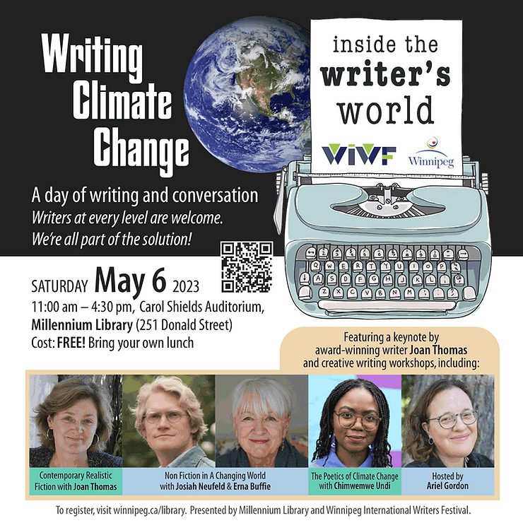 Calling all Aspiring Writers or Environmental Activists. This is a free event which includes writing workshops! To register or learn more visit winnipeg.ca/library or phone 204-986-6450